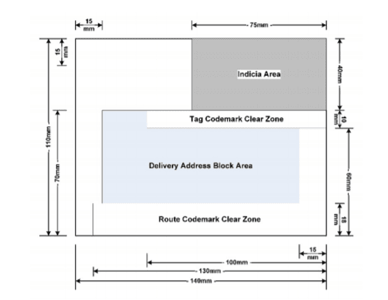 Position – The Access PPI must be located on the front of the Letter, above and to the right of the Delivery Address and in the top right corner of the Letter in the Indicium area shown below. This area is 75mm long & 40mm high.